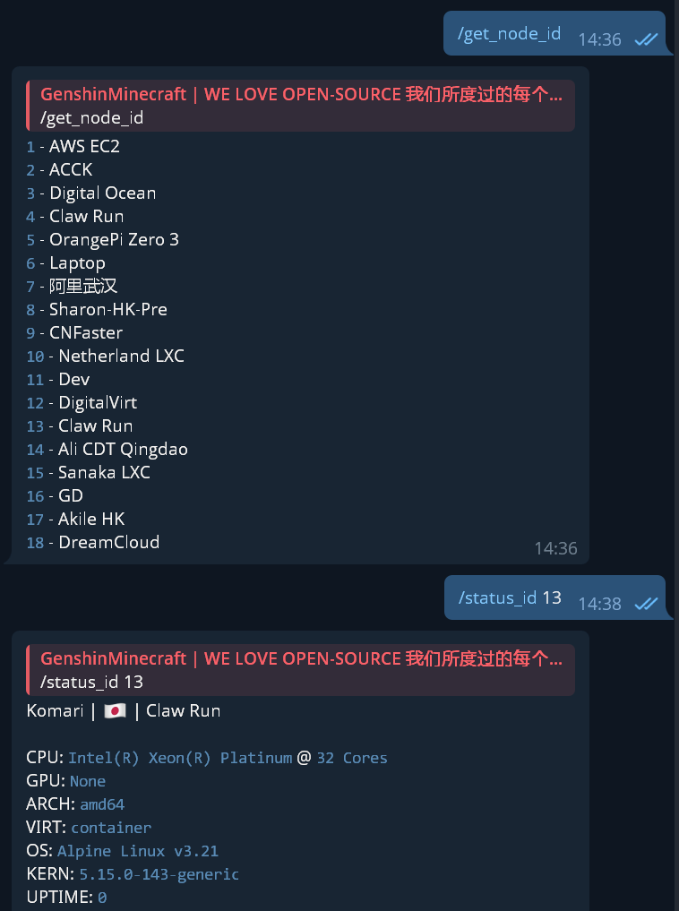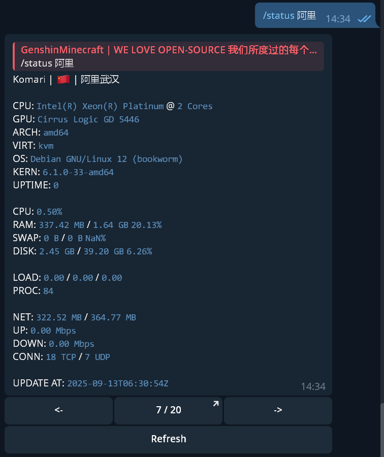Komari 提供了非常多的同时发送渠道,我建议使用 Telegram Bot 或者 @komaritgbot 提供的通知服务,这样查询与通知可以绑定在一个 Bot 内